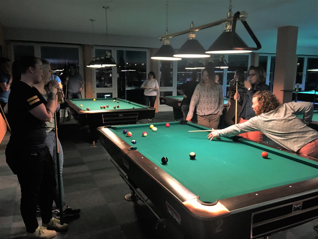 Am zweiten Teil des Abends stand Billard auf dem Programm. In Reiden existiert seit knapp 2 Jahren ein Billard- Center, gut versteckt im Industriequartier. Die einen oder anderen hatten bereits schon Erfahrungen im Billiard gesammelt, wenn auch meist ein paar Jahre zurückliegend. Schnell bildeten sich spontan einige 2-er Gruppen, welche das Spiel gegeneinander aufnahmen. Es wurde viel gelacht ob dem mehr oder weniger erfolgreichen Spiel auf dem grünen Tisch. Einige erwiesen sich schon fast als ausgewiesene Profis, so kunstvoll waren die Spielzüge. Oder war es einfach nur Glück, dass die eine oder andere Kugel so schön ins Loch rollte?